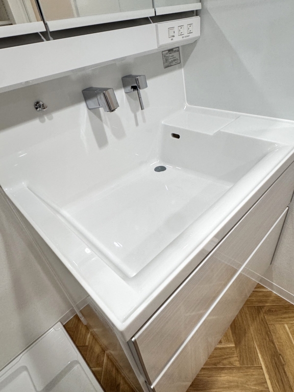 洗面化粧台の水栓はハイバックタイプで掃除もしやすいですね。